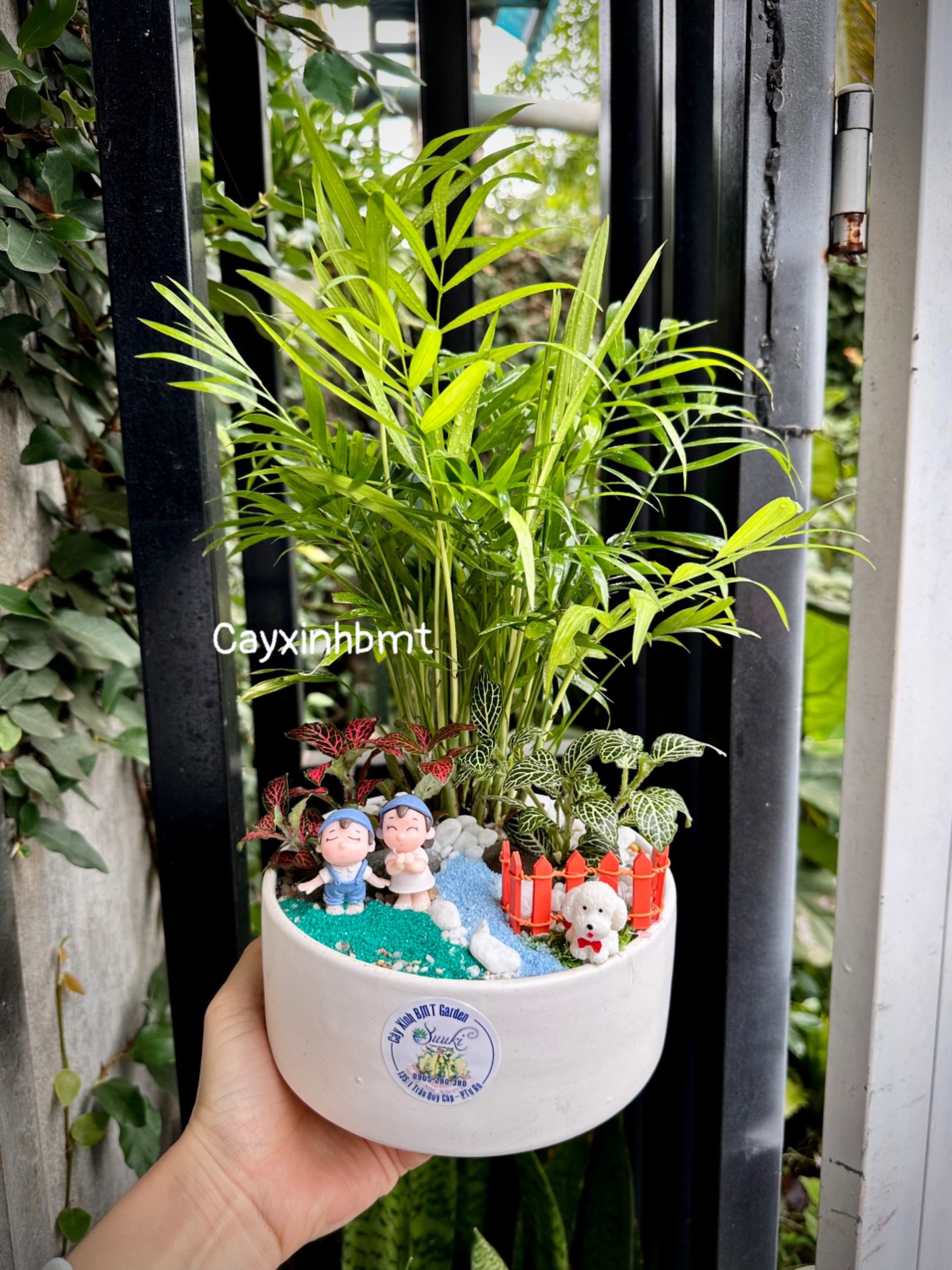 -Set quà tặng tiểu cảnh cau tiểu trâm mix cẩm nhung, món quà ý nghĩa, mang may mắn, hạnh phúc và tài lộc đến với người nhận. Chậu đường kính 14cm, có thể trang trí và decor theo yêu cầu của khách hàng.